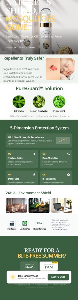 PureGuard™ Essential Oil is a lab-proven, natural mosquito repellent that delivers a 99.2% repellency rate, offering powerful protection without the harsh chemicals found in traditional DEET-based products. Crafted from a blend of USA EPA-certified active ingredients, it creates an invisible, long-lasting shield against mosquitoes, making it the ideal choice for families, outdoor enthusiasts, and anyone seeking a safer alternative.